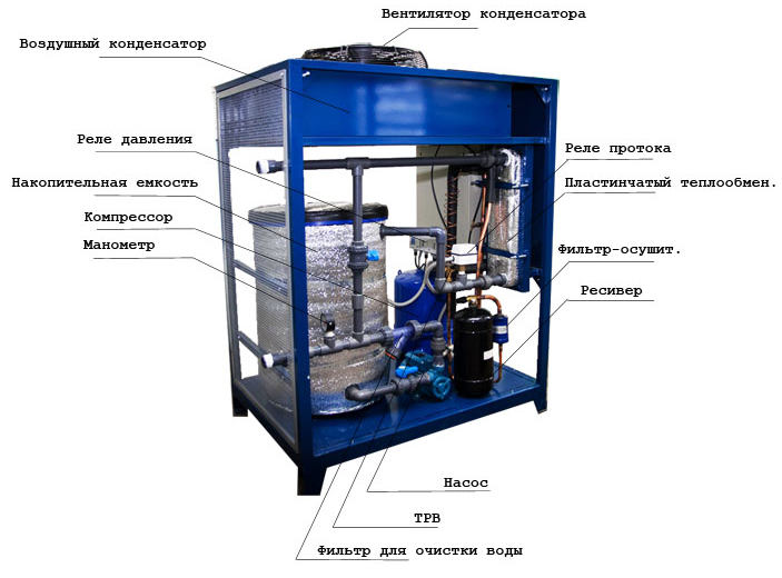 Принцип действия чиллера можно сравнить с работой холодильника, поскольку это тот же тепловой насос, который забирает энергию у охлаждаемой жидкости и отводит ее из системы. Различают парокомпрессоинные и абсорбционные чиллеры.